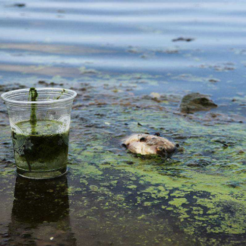 使用除臭劑之前,水面漂浮大量污染物喝水腥氣刺鼻,