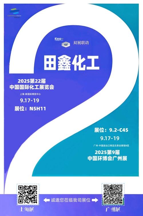 2025年9月17-19日上海化工展和環(huán)博會廣州展同時開展,田鑫化工參展信息如下: